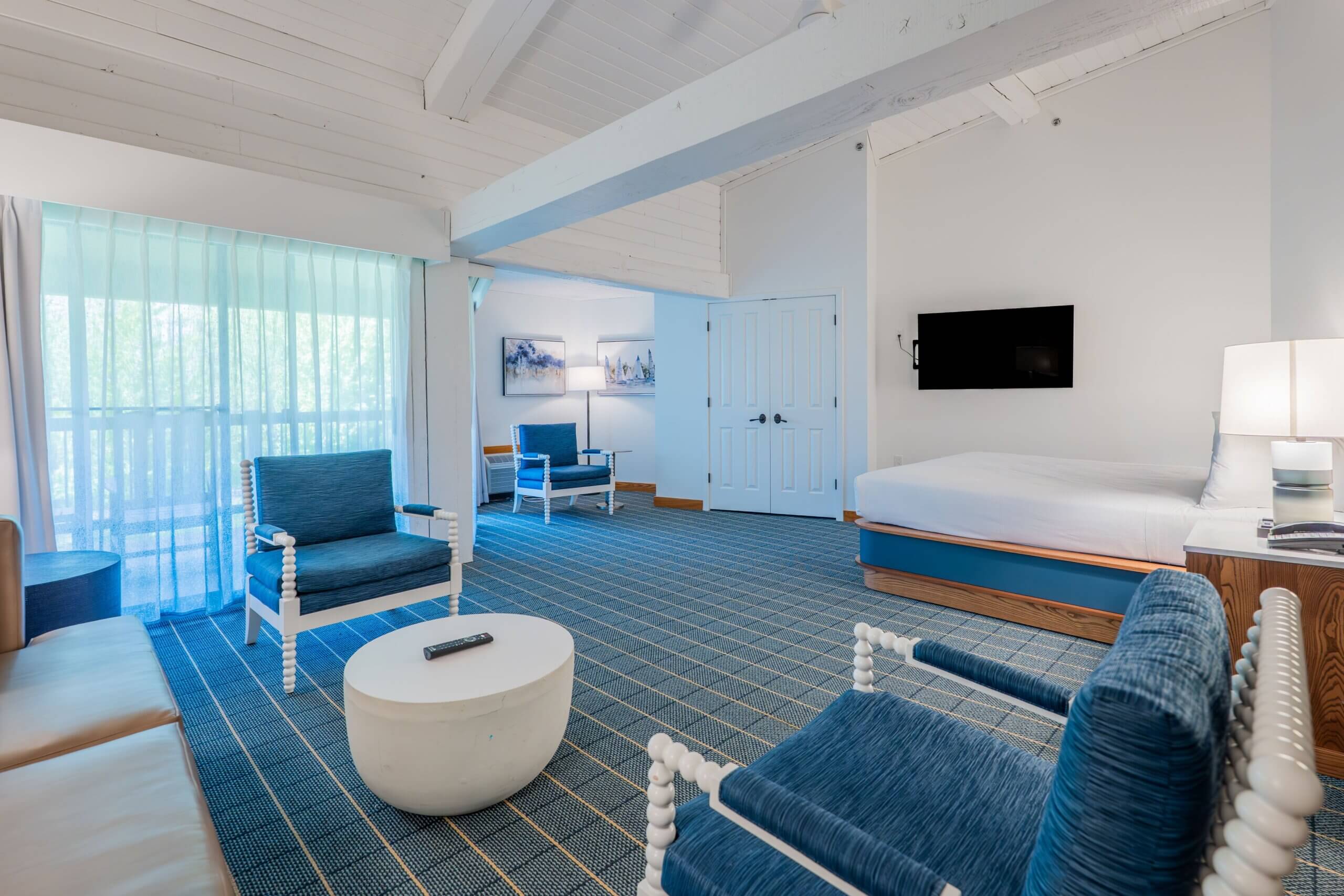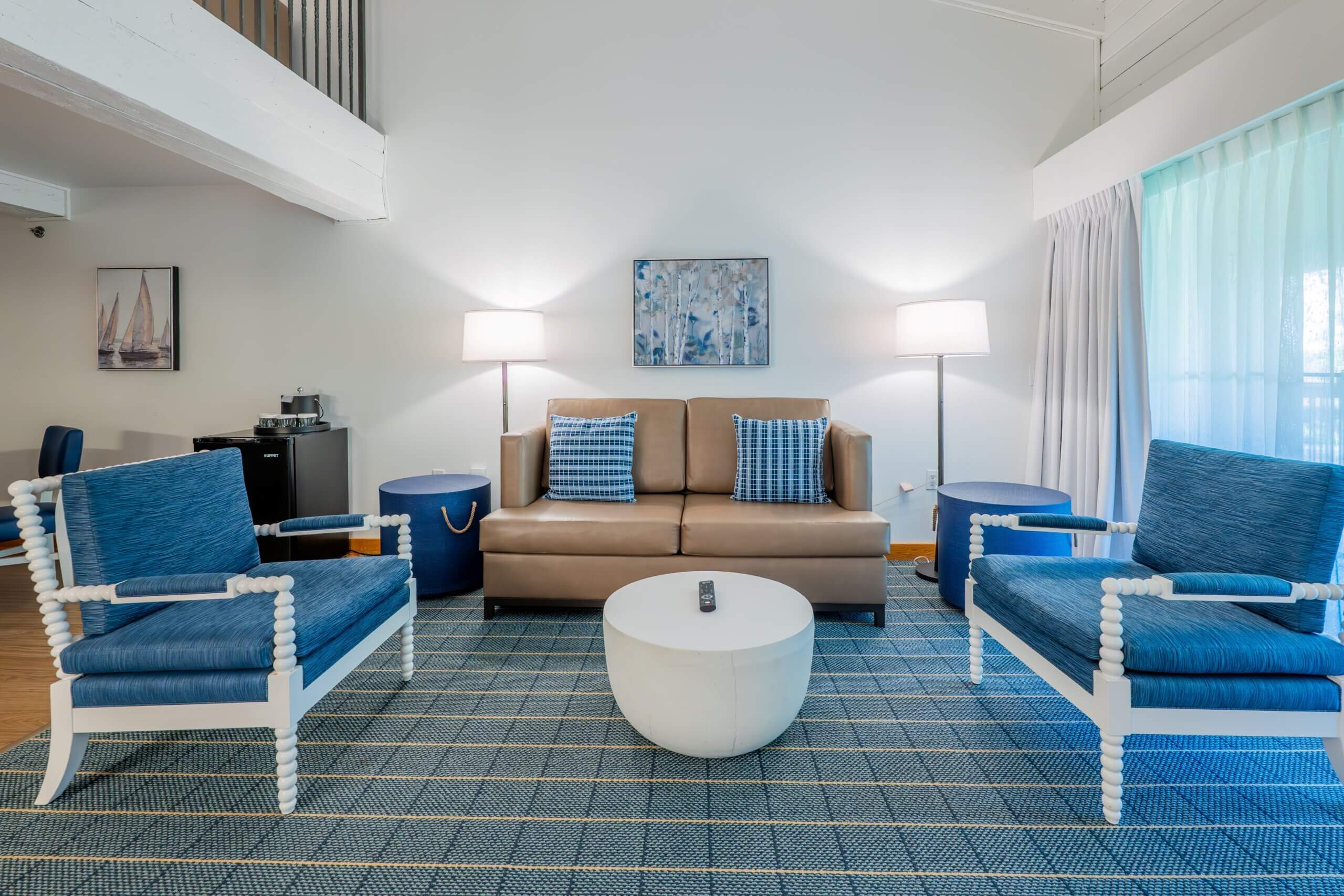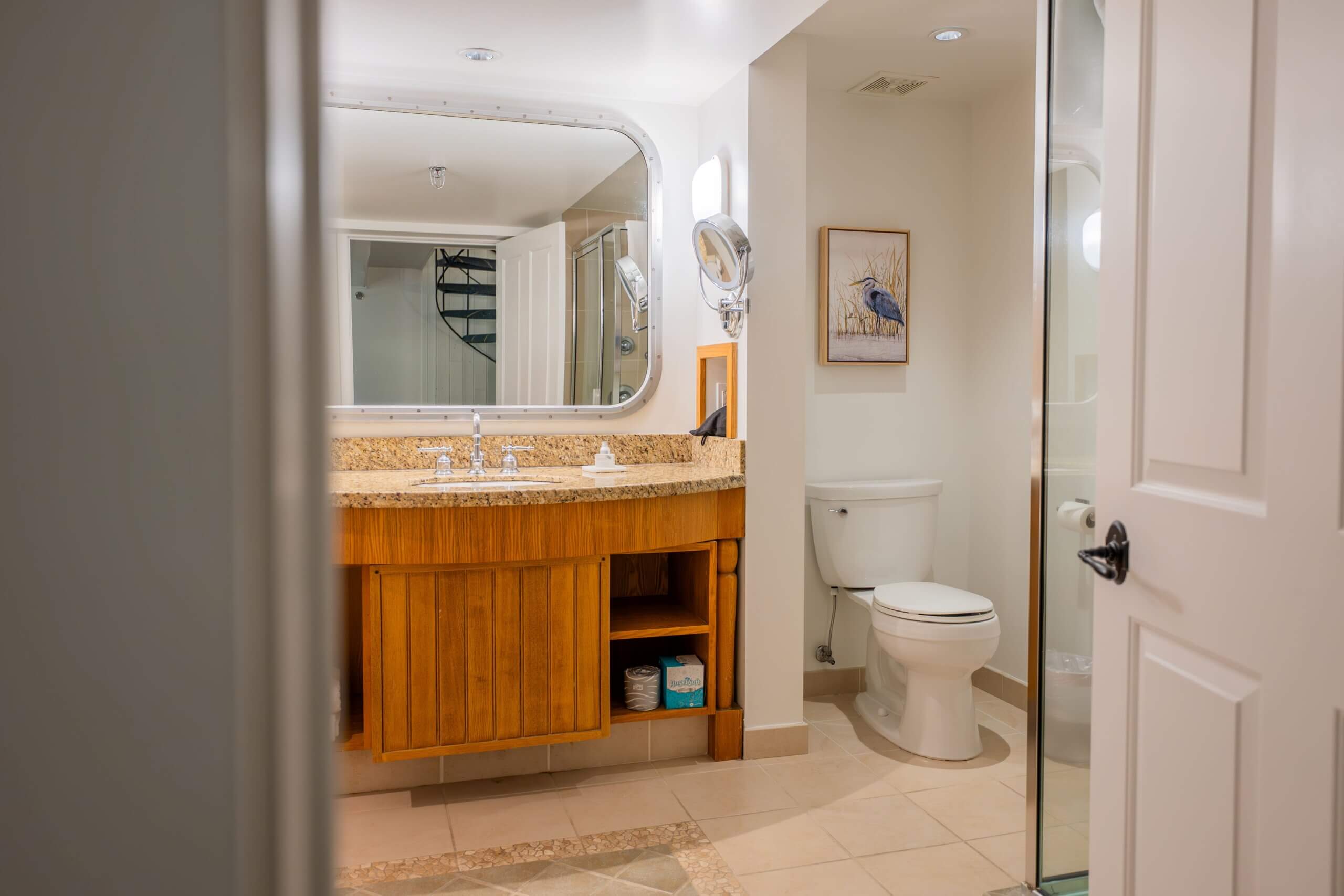 The spacious main level features a King-sized bed, Queen-sized sofa sleeper, sitting area, wet bar, and a kitchenette with two burner range. The loft area above features a Queen-sized bed and another Queen-sized sofa sleeper. Enjoy a private balcony, deluxe granite bathrooms featuring spa bath products from our own award-winning Calladora Spa along with a Kohler Bubble Massage tub and shower, are sure to allow for relaxation at the end of each day.