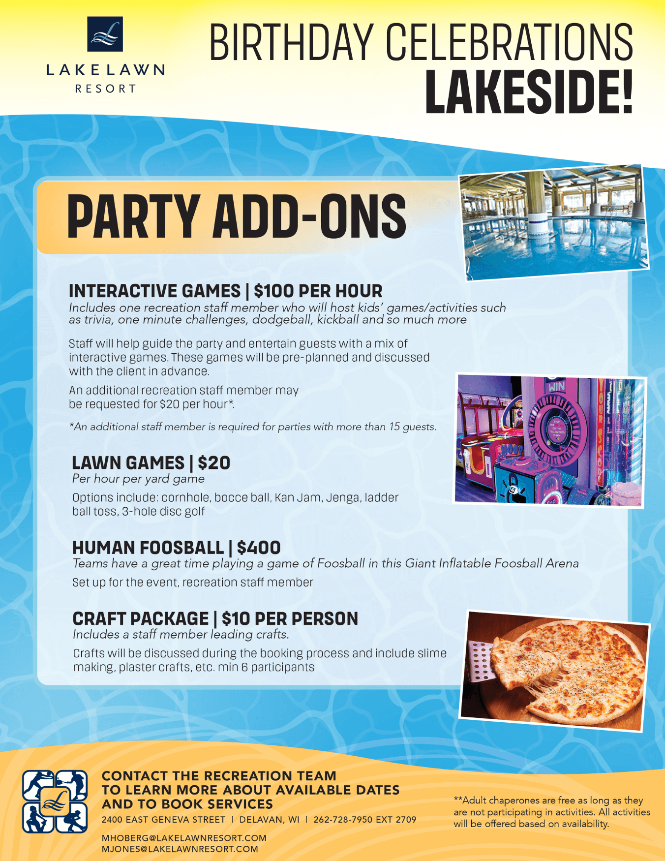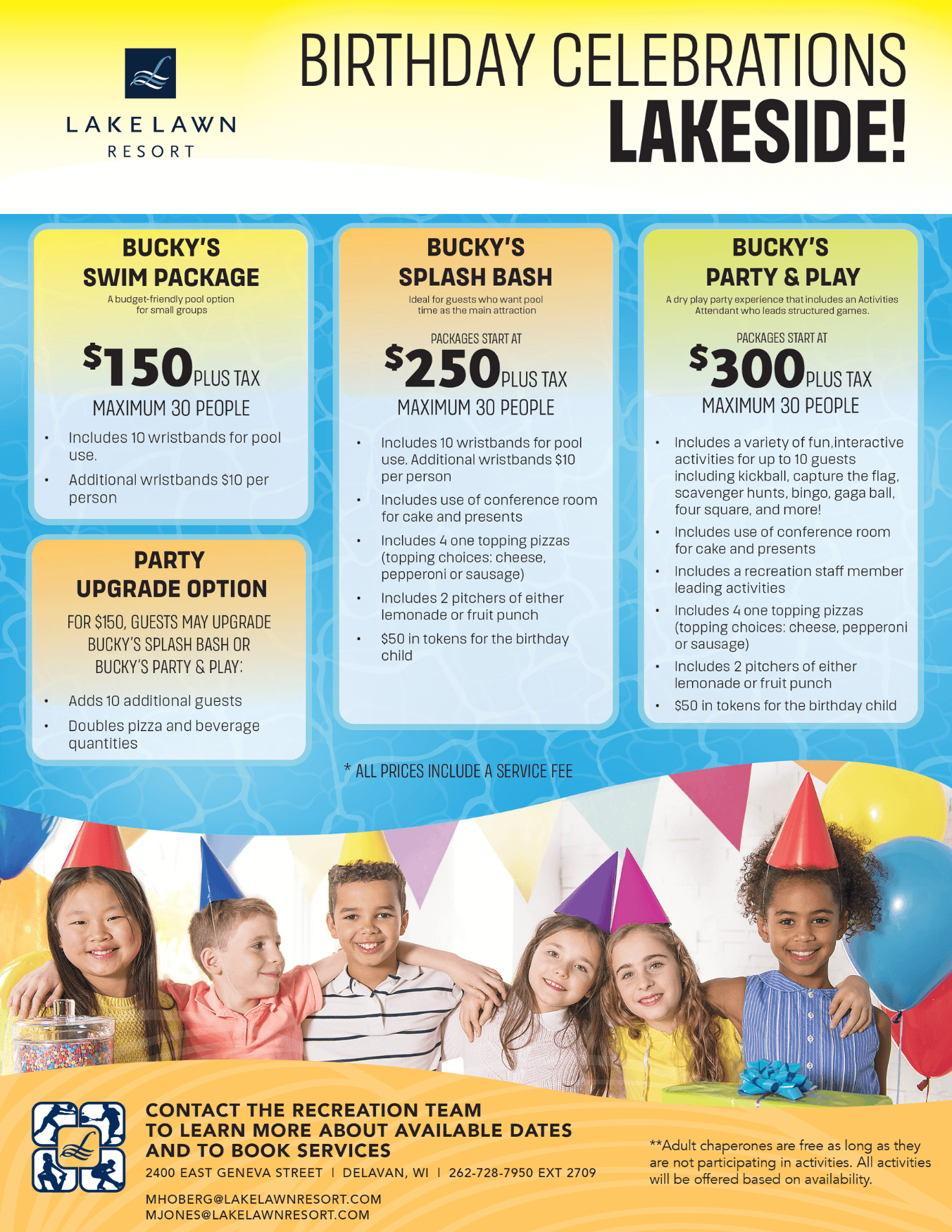 Birthday celebrations Birthday Party Inquiry Form "*" indicates required fields CompanyThis field is for validation purposes and should be left unchanged.Name* First Last Email* Phone Number*How would you like us to contact you?EmailPhoneWhat birthday package are you interested in?Select a packageBucky's Swim Package $150+Bucky's Splash Bash $250+Bucky's Party & Play Package $300+How many children will be attending the party?Preferred Party Date MM slash DD slash YYYY Additional commentsCAPTCHA